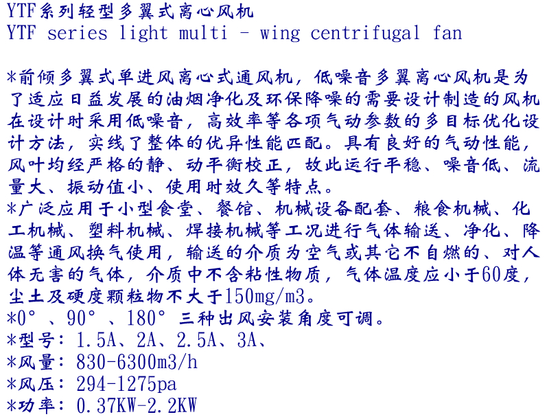 輕型多翼式離心風機,廣泛應用于小型食堂、餐館、機械設備配套、糧食機械、化工機械、塑料機械、焊接機械等工況進行氣體輸送、凈化、降溫等通風換氣使用。