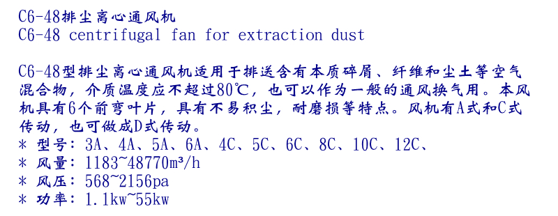 c6-48后傾式工業離心通風機適用于排送含有本質碎屑、纖維和塵土等空氣混合物,介質溫度應不超過80℃,也可以作為一般的通風換氣用。本風機具有6個前彎葉片,具有不易積塵,耐磨損等特點。